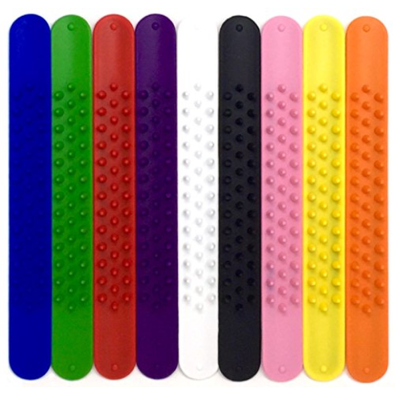 SPIKY Silicone Slap Bracelets make GREAT Party Favors for kids' birthday parties. We value YOU and Your Children; so, don't settle for those horribly low quality plastic slap bracelets that easily fall apart and can even be dangerous. Silicone Slap Bracelets are Color Coated, which make them soft and SAFE. 100% Latex Free Silicone encase a high quality metal coil. These won't fall apart and will last a looooong time - even in the hands (or around the wrists) of highly energetic boys and girls. Great Fidget Sensory Tactile Toy for Children with ADD/ADHD, Autism, Anxiety, or OCD to Promote Focus, Attention, Calm while Reducing Stress. Colors Used are Red, Blue, Pink, Purple, Black, Orange, Yellow, White, and Green.